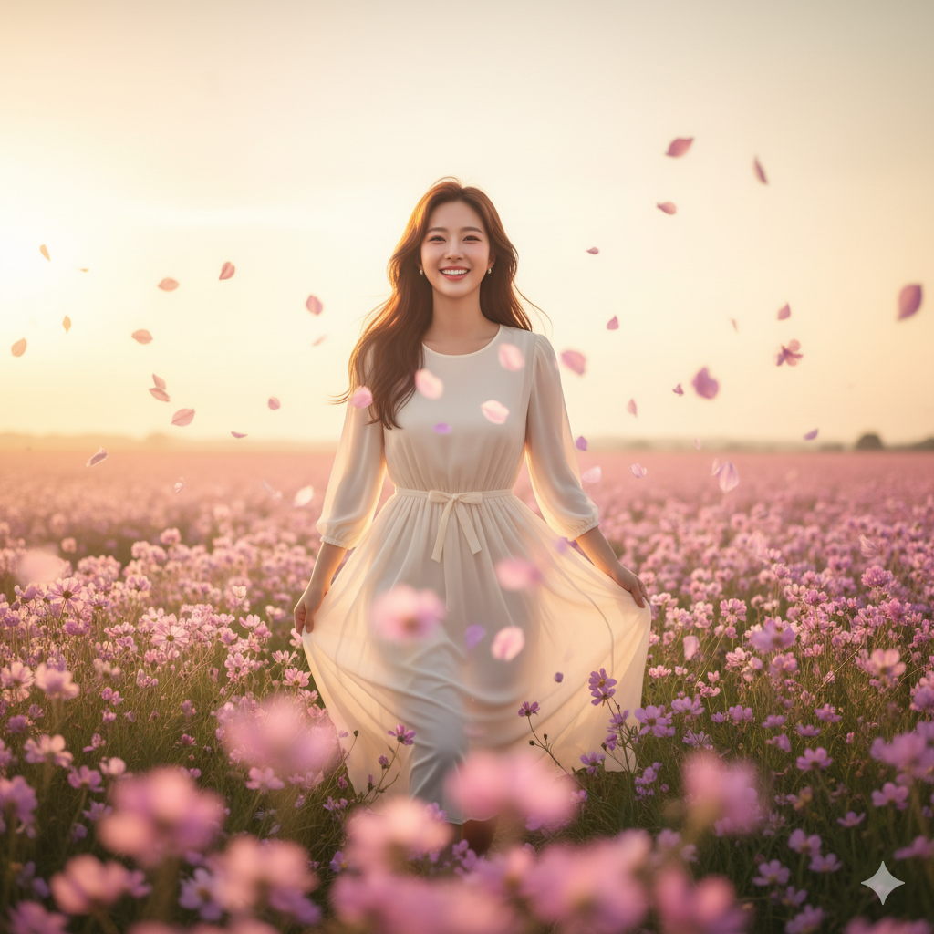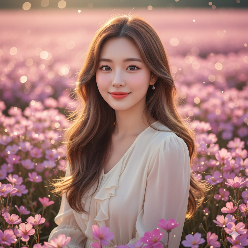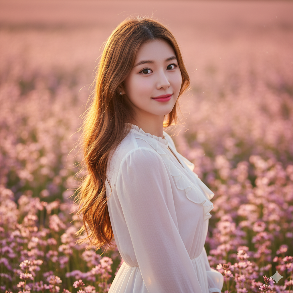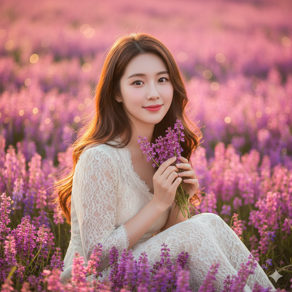 ภาพถ่ายพอร์ตเทรตหญิงสาวเกาหลีหน้าตาน่ารักสดใส ยืนอยู่กลางทุ่งดอกไม้เรสสเวียสีชมพู–ม่วงเรืองแสงในยามเย็น แสงแดดอบอุ่นสะท้อนกลีบดอกเป็นประกายระยิบระยับ