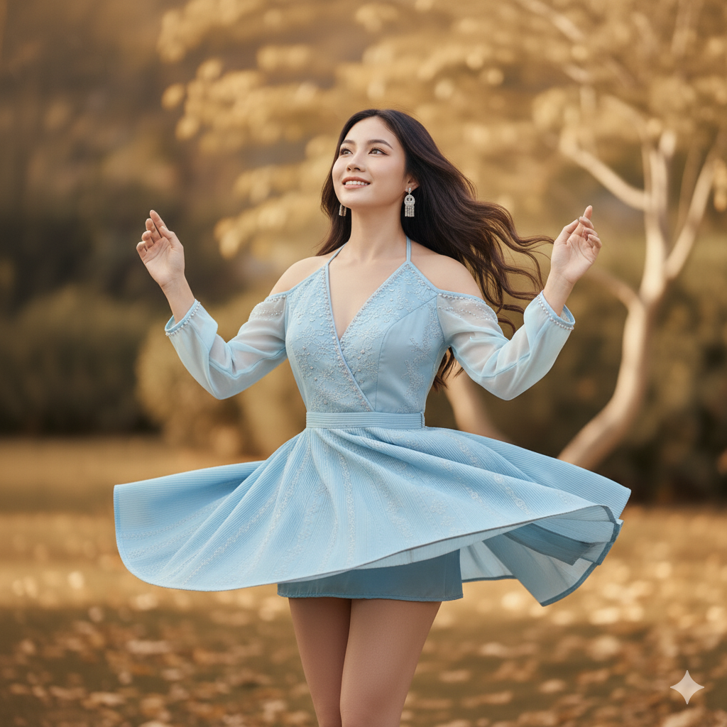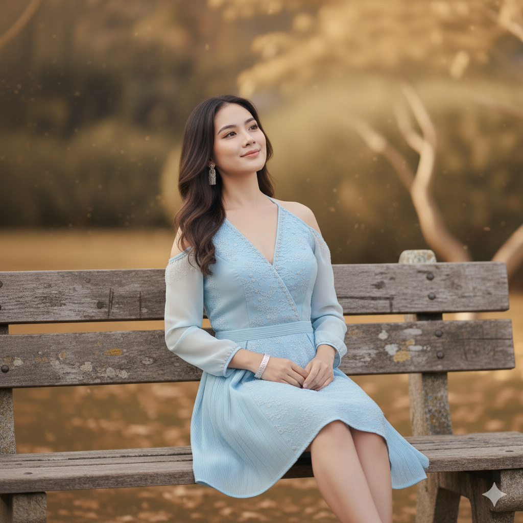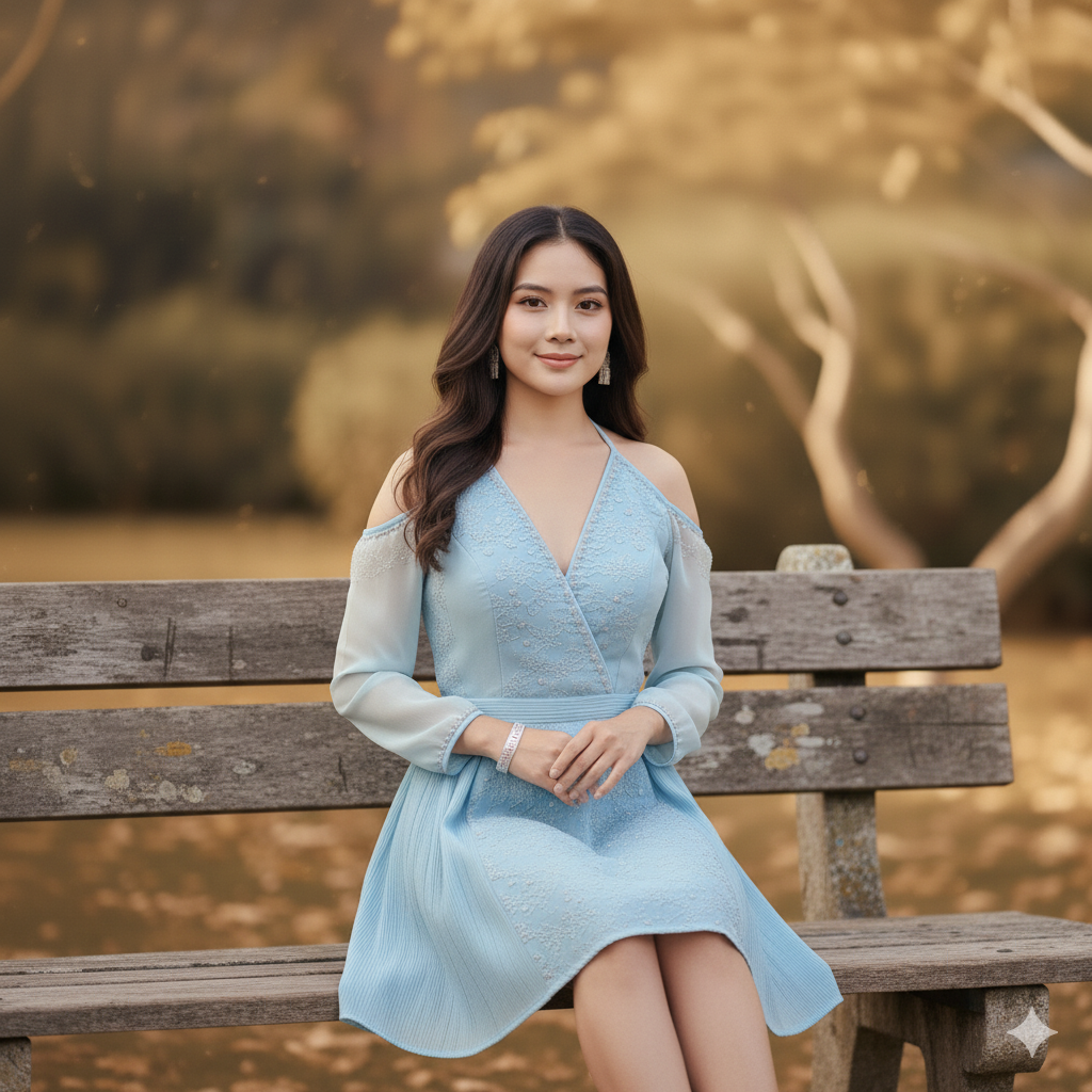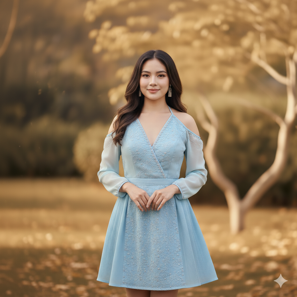 ท่าทาง: ยืนในสวนธรรมชาติ หันตัวเล็กน้อย มือแตะกันเบา ๆ หน้าเชิดอ่อน ๆ ยิ้มละมุน