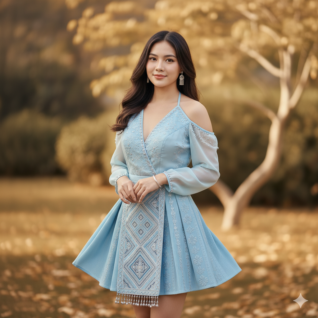 ด้านหน้ามี แผ่นผ้าปักลวดลายม้งแนวตั้ง สีฟ้า–ขาว–เงิน ลวดลายเรขาคณิตแบบดั้งเดิม ตกแต่งด้วยพู่เงินและลูกปัดเล็ก ๆ ที่ขอบล่าง เพิ่มเอกลักษณ์ชาติพันธุ์