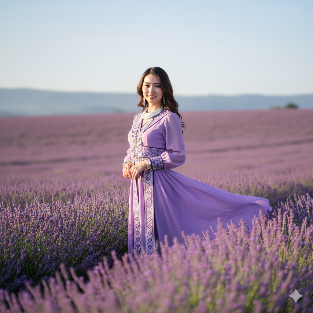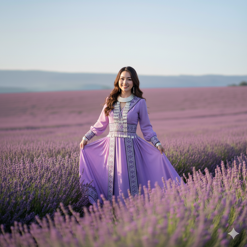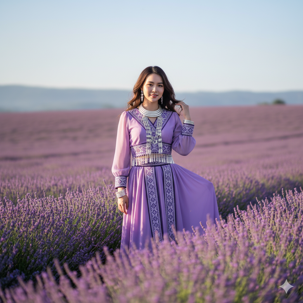 ท่าทาง: ยืนตรงกลางทุ่งลาเวนเดอร์ มือข้างหนึ่งจับชายกระโปรงเบา ๆ อีกข้างวางข้างลำตัว สายตามองกล้องด้วยรอยยิ้มอบอุ่น