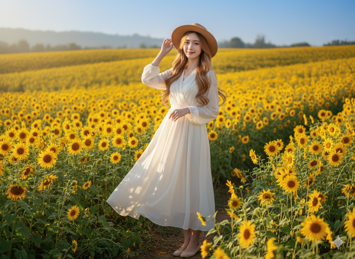 เธอยืนหรือนั่งโพสอย่างสง่างามกลางทุ่ง มือหนึ่งแตะหมวกเบา ๆ สายตาอ่อนโยน มองกล้องด้วยรอยยิ้มอบอุ่น
