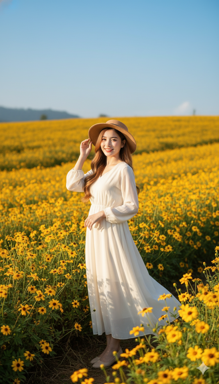 สร้างภาพถ่ายเหมือนจริงของหญิงสาว (ใช้ใบหน้าจากภาพอ้างอิงของฉันโดยตรง) ยืนอยู่กลาง ทุ่งดอกบัวตองสีเหลืองทองเต็มเนินเขา ท้องฟ้าสีฟ้าใส แสงแดดยามเช้าส่องผ่านอย่างนุ่มนวล ให้โทนภาพอบอุ่น สดใส มีชีวิตชีวา